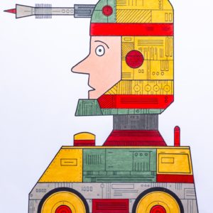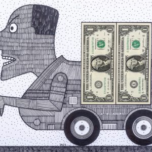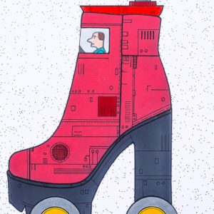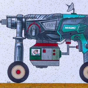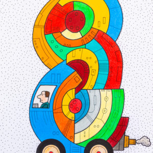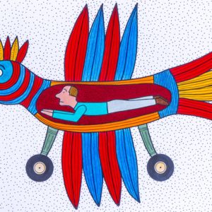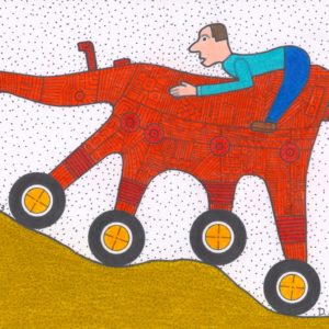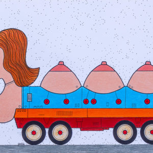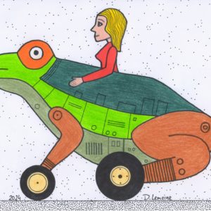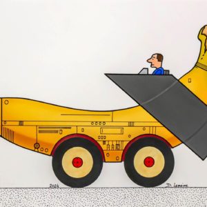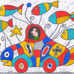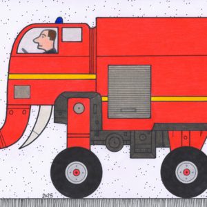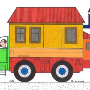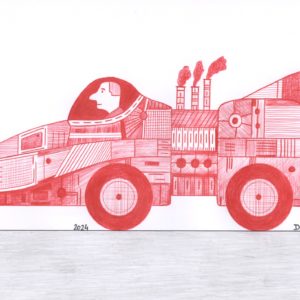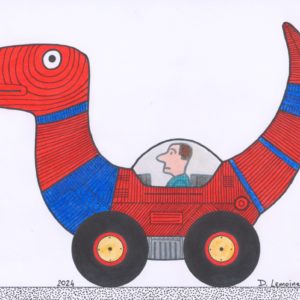 Mais ce n’est que récemment, en feuilletant le catalogue d’exposition de la Collection de l’Art Brut de Lausanne « Véhicules », découvert en 2016 que le talent de Dominique a explosé et qu’il s’est lancé dans l’aventure… Depuis il travaille quotidiennement avec passion, avec joie. Son imagination est sans limite. Poisson volant, camion transportant des maisons, femme-cafetière au sein agressif, voiture-dragon ou montgolfière, éléphant sur roues… Et parfois tout se mélange, la mécanique, les bêtes fantastiques, les personnages et les Vénus. » Sophie Lepetit